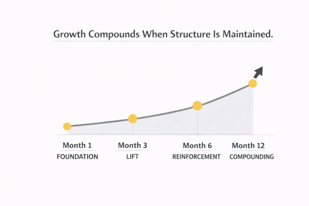 In stable growth systems, month twelve looks stronger than month three, not because tactics changed, but because structure matured.